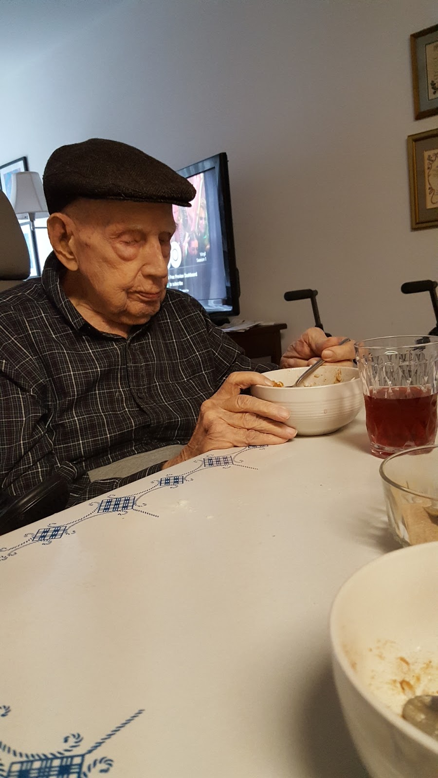Søren varmede den og vi dækkede bord….og John glædede sig. Da han spiste den første skefuld, sagde han: “Det er himmelsk- hvis I vidste, hvor længe jeg har længtes efter dette”. Tænk, at der kun skal en god portion risengrød og vores selskab til at gøre den søde, gamle John lykkelig. 😊