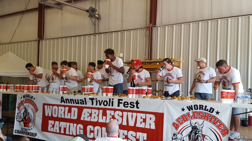 På byens brandstation blev der i dag serveret øl og hotdogs og spillet lidt live musik. Imorgen afholdes den første Æbleskive-ædedolke konkurrence. Og vinderen får en god slat penge og kommer i Guinness Book of Records.